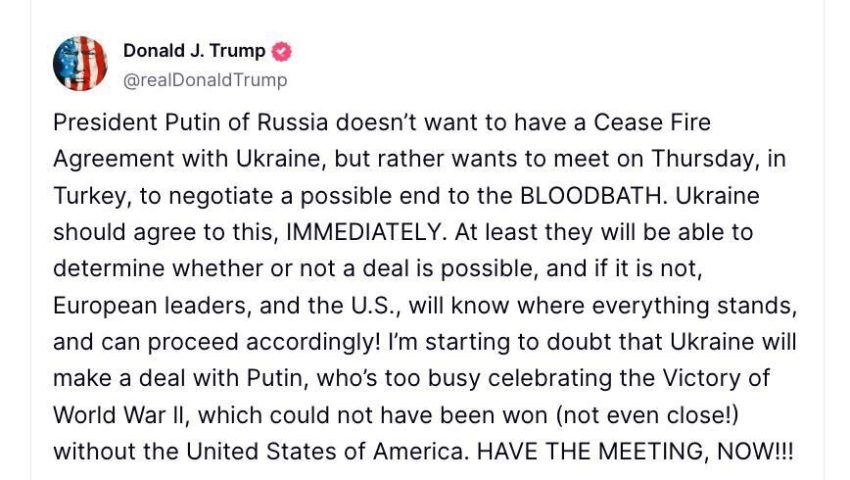 В публикация в социалната си платформа Truth Social в неделя (11 май) обаче Тръмп заяви, че „започва да се съмнява, че Украйна ще сключи сделка с Путин“.