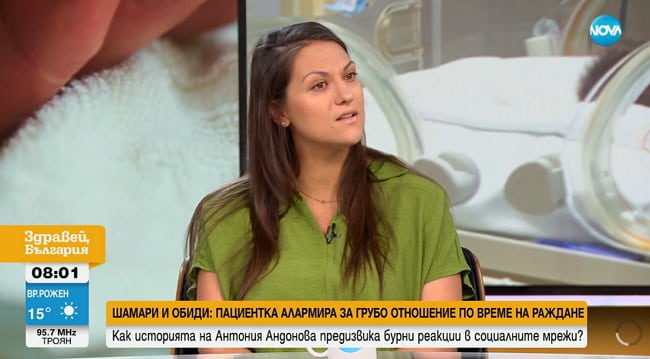 „Влязох в родилна зала с 5 сантиметра разкритие. Дори няма да коментирам болките, които изпитвах преди това. Всяка жена преживява по различен начин бременността и раждането. Моето просто беше по-болезнено и го приех. Даже имаше реакции от екипа в болницата как между контракциите съм толкова усмихната, пък после много ме боли. Проблемът започна при желанието от моя страна да ми се постави упойка. Бях преместена от родилна зала на самоход. Сложиха ме на кушетката, не мога да го нарека магаре. По никакъв начин не съм си позволила да крещя, да се карам. Аз съм безкрайно уважителен човек. Казах само, че ще предупредя кога имам контракция, за да не ме боцкат точно в този момент, за да не стане беля. Казвам го с треперещ глас, боли ме. И в този момент, когато казвах това, зад гърба ми, където беше вратата, се протегна една ръка и тази ръка си ме шамароса. Не съм пребита, това са преекспонирани цитати“, разказа Антония.