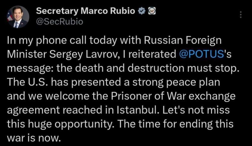 Държавният секретар Марко Рубио коментира телефонния разговор, състоял се днес между него и руския външен министър Сергей Лавров: