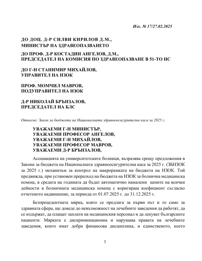 „БЛС и организациите на всички болници у нас – Асоциация на университетските болници, Национално сдружение на областните многопрофилни болници за активно лечение, Сдружение на общинските болници в България, Национално сдружение на частните болници и Българска болнична асоциация, сме обединени в общата ни позиция против предложения в Проекта за бюджет на НЗОК механизъм за контрол на макрорамката на бюджета на Касата. Той предвижда, при установен преразход на бюджета на Здравната каса, в средата на годината и то само в Болнична помощ, да бъдат намалени цените на всички клинични пътеки“. Това се посочва в становище на организациите, изпратено до медиите.
