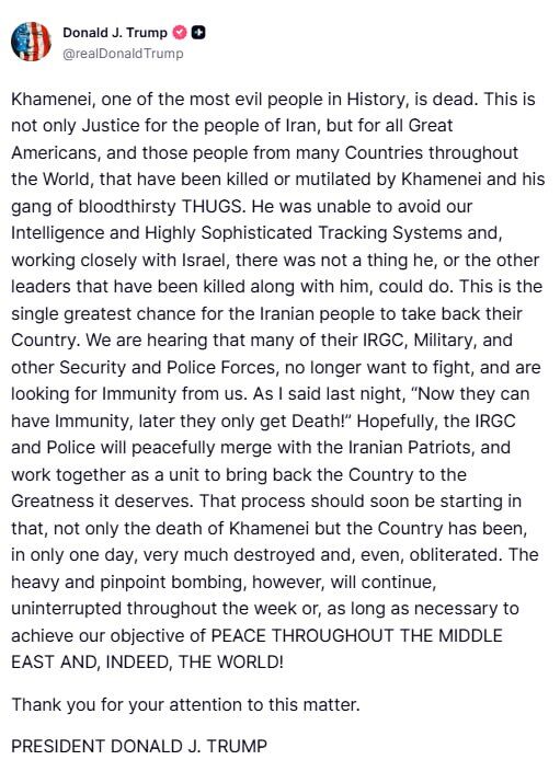 „Той не можеше да се скрие от нашето разузнаване и сложни системи за проследяване и с тясното ни сътрудничество с Израел, нито той, нито другите лидери, убити заедно с него, можеха да направят нещо. Това е най-големият и единствен шанс, който иранският народ има да си върне страната. Чуваме, че много от техните членове на Корпуса на гвардейците на ислямската революция, военните и други сили за сигурност и полицията вече не искат да се бият и търсят имунитет от нас. Както казах снощи: „Сега могат да получат имунитет, по-късно ще получат само смърт!“ Надявам се Корпусът на гвардейците на ислямската революция и полицията мирно да се обединят с иранските патриоти и да работят заедно, за да възстановят страната до величието, което заслужава.“ Този процес трябва да започне незабавно, тъй като само за един ден не само Хаменей беше убит, но и самата страна беше до голяма степен разрушена и дори заличена от картата. Въпреки това, мощните и целенасочени бомбардировки ще продължат без прекъсване през цялата седмица или толкова дълго, колкото е необходимо, за да постигнем нашата цел – МИР В ЦЕЛИЯ БЛИЗЪК ИЗТОК И, САМО ЗА ДА, В ЦЕЛИЯ СВЯТ!