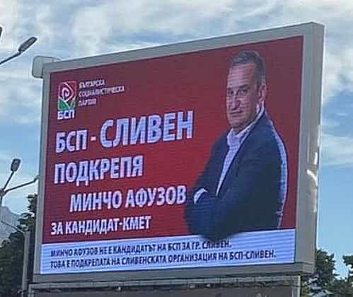 Тя посочва, че Афузов с билбордове лъже, че е подкрепен от БСП като е използвал цветовете, логото и името на партията, след като партийната конференция в Сливен е отказала БСП да го издигне.